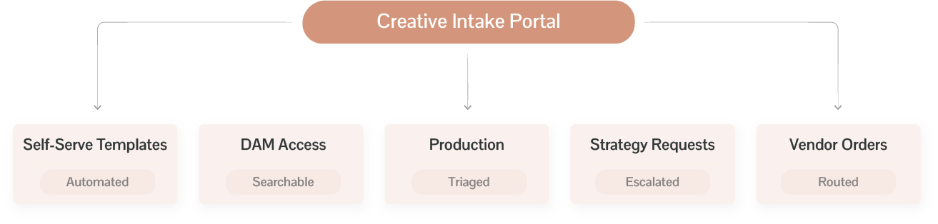 I designed a structured intake system that replaced ad-hoc requests with guided, self-service pathways. By combining consultation-based workflows, standardized request types, and lightweight automation, the system reduced noise, clarified scope, and elevated the creative team from order-takers to strategic partners.