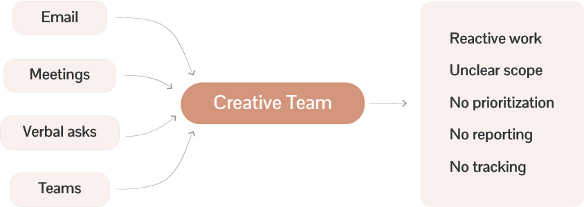 The creative team was overwhelmed by one-off requests, unclear scopes, and fragmented workflows. Work entered through multiple channels with no consistent prioritization, making it difficult to focus on high-impact initiatives or operate strategically.
