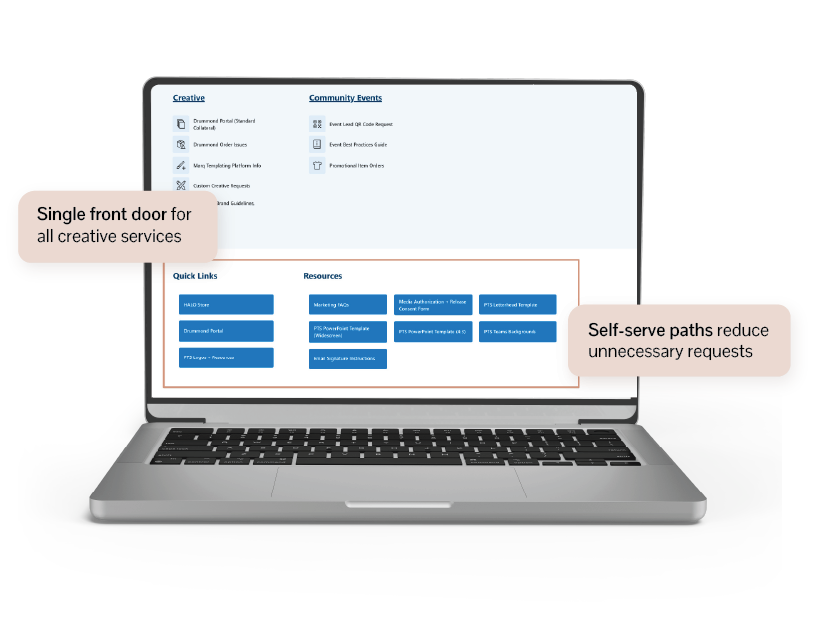 A centralized intake system routes work based on type, urgency, and complexity - allowing the team to prioritize strategically while enabling self-serve for high-volume needs.